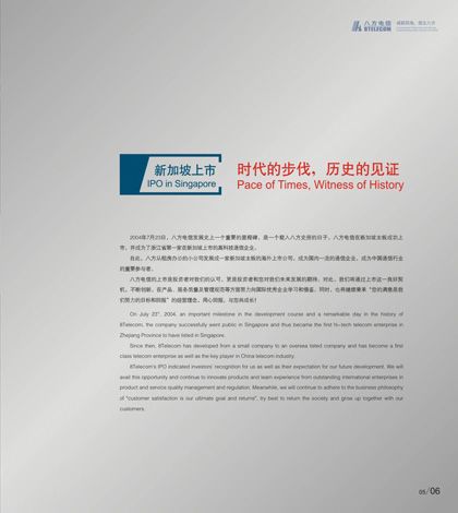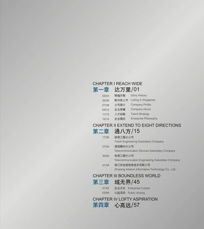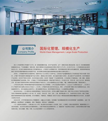 浙江八方電信有限公司創建于1997年,是一家集通信器材設備、軟件產品的研發、生產、銷售及電信工程設備安裝、施工為一體的集團型國家級高新技術企業。下設通信器材、鐵塔工程、電信工程和浙江安迪信信息技術有限公司四個分子公司。2004年7月23日,八方電信在新加坡主板市場成功上市,成為浙江省首家在新加坡上市的高科技企業。公司現有百余項國家專利,并具有國家電信工程專業承包壹級資質、通信信息網絡系統集成乙級資質,是目前國內發展較迅速的通信網絡設備及解決方案供應商之一。 銘陽廣告公司作為八方電信集團主要的平面設計業務合作商,先后為其做過畫冊設計、期刊設計、工廠環境設計、辦公及車間內企業文化宣傳設計等,產品及服務受到八方電信集團各部門一致好評。