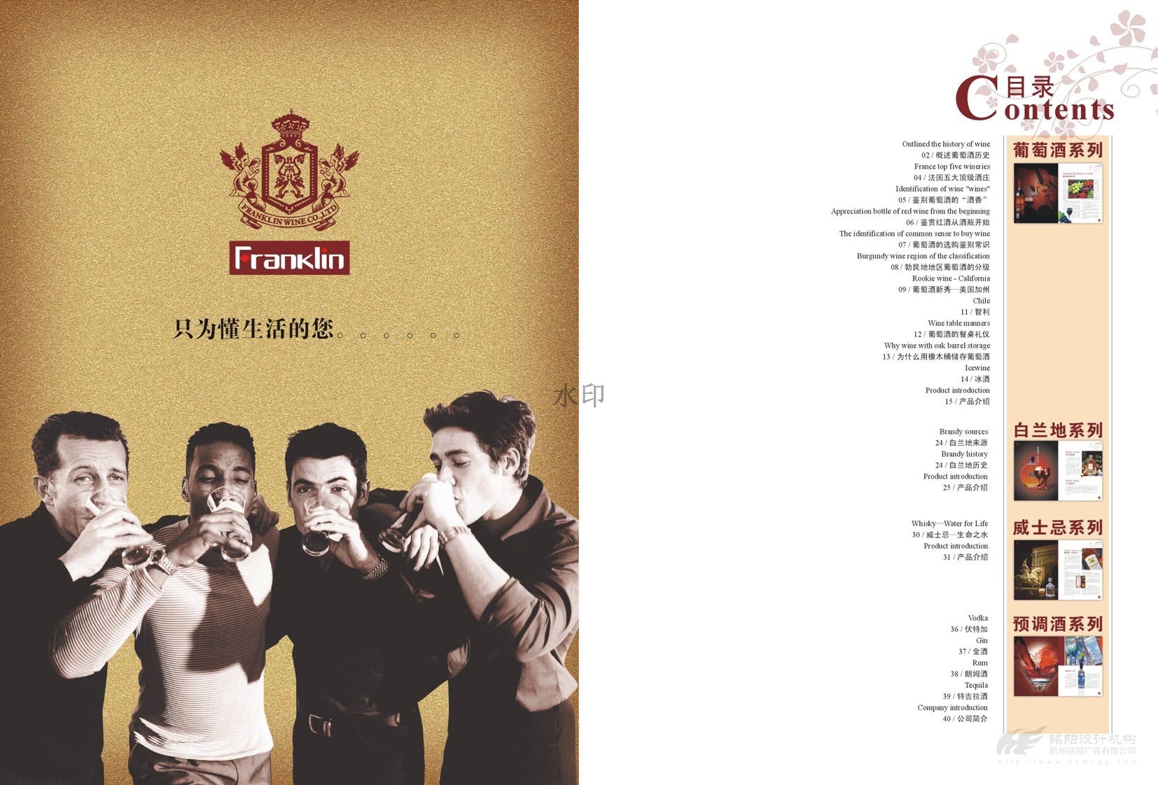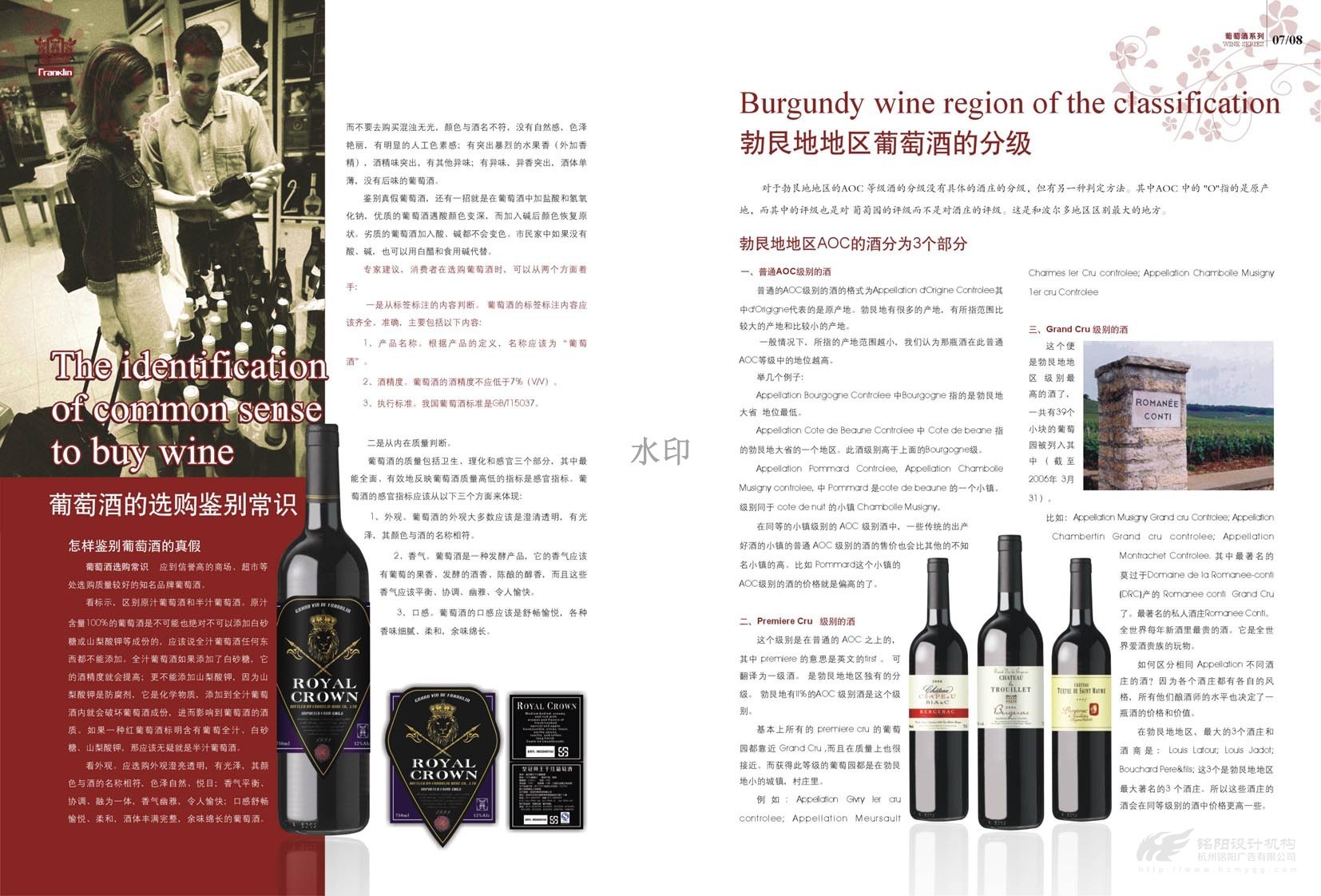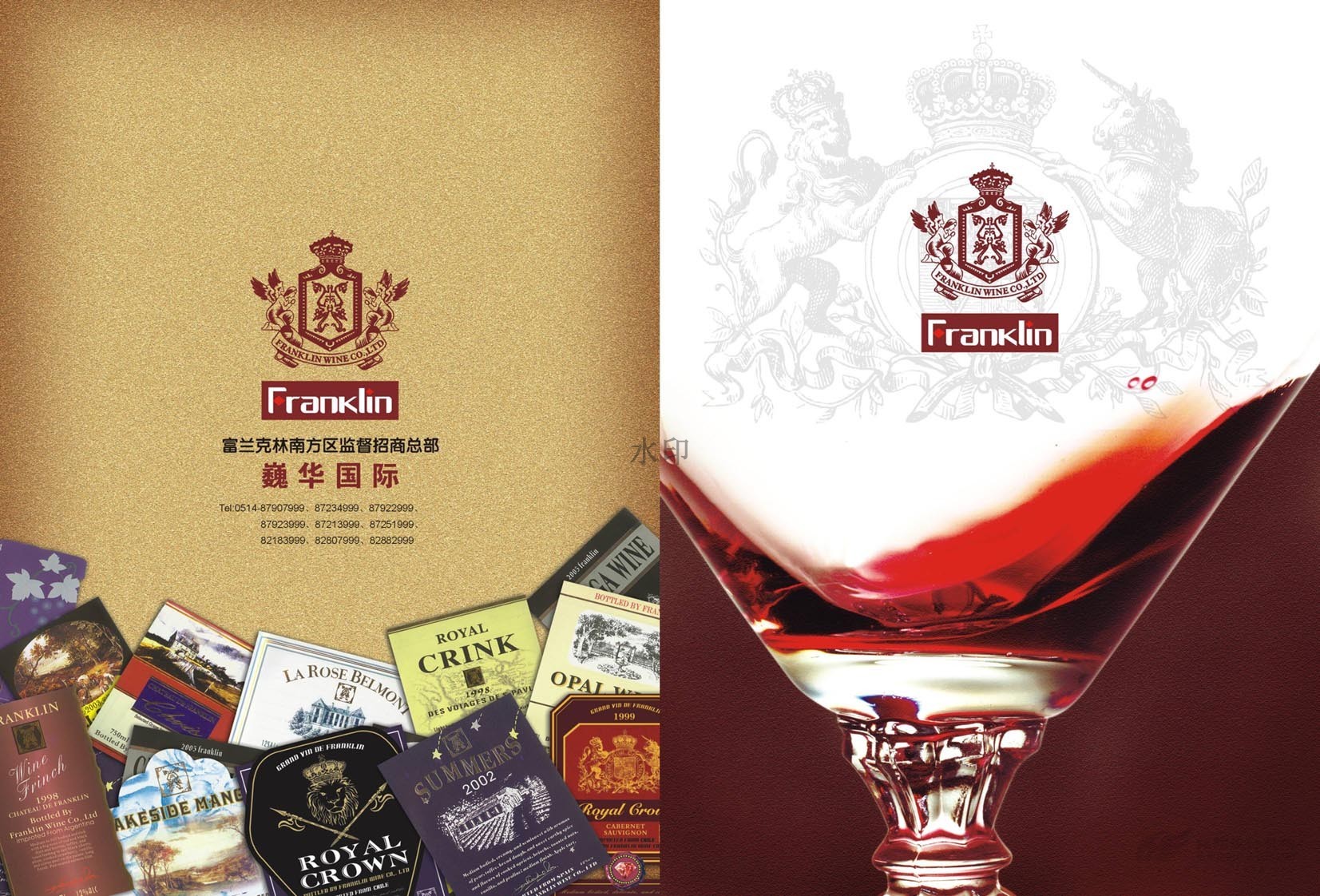 “只為懂生活的您......”,“一次邂逅·此生心傾”。美國富蘭克林酒業成立于1933年,是美國第二大品牌,宣傳冊設計概述了葡萄酒歷史,法國五大頂級酒莊,如何鑒別、鑒賞紅酒,葡萄酒的分級及餐桌禮儀等。圖文并茂,精美絕倫,是一本值得收藏的畫冊。